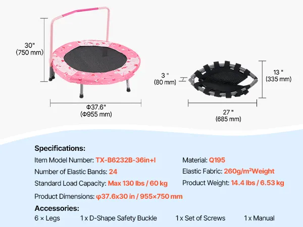 De trampoline is uitgerust met een PP-springmat en randkussen, platte elastische banden, rubberen hoofdpootbuizen en met schuim beklede handgrepen, waardoor stevigheid en duurzaamheid worden gegarandeerd en gemakkelijk schoon te maken en te onderhouden is.