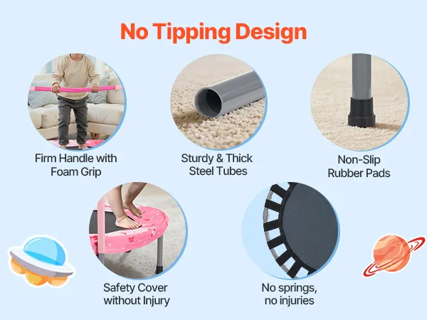Versterkte poten: deze mini-peutertrampoline is uitgerust met een stevig frame, PP-springmat, veiligheidskussens, platte elastische banden, rubberen poten en met schuim beklede handvatten en is gebouwd om lang mee te gaan. De nieuw verbeterde, versterkte poten zijn bestand tegen buigen en vervormen en zorgen voor een stevige stabiliteit. De rubberen voetkussens zorgen voor geruisloos springen.