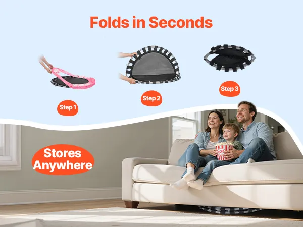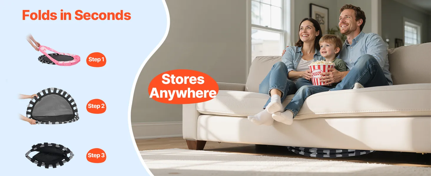 Onze minitrampoline voor baby's en peuters is dankzij het opvouwbare ontwerp gemakkelijk te vervoeren, zodat kinderen overal kunnen stuiteren. Hij kan onder de banken of in de kofferbak worden opgeborgen om ruimte te besparen.