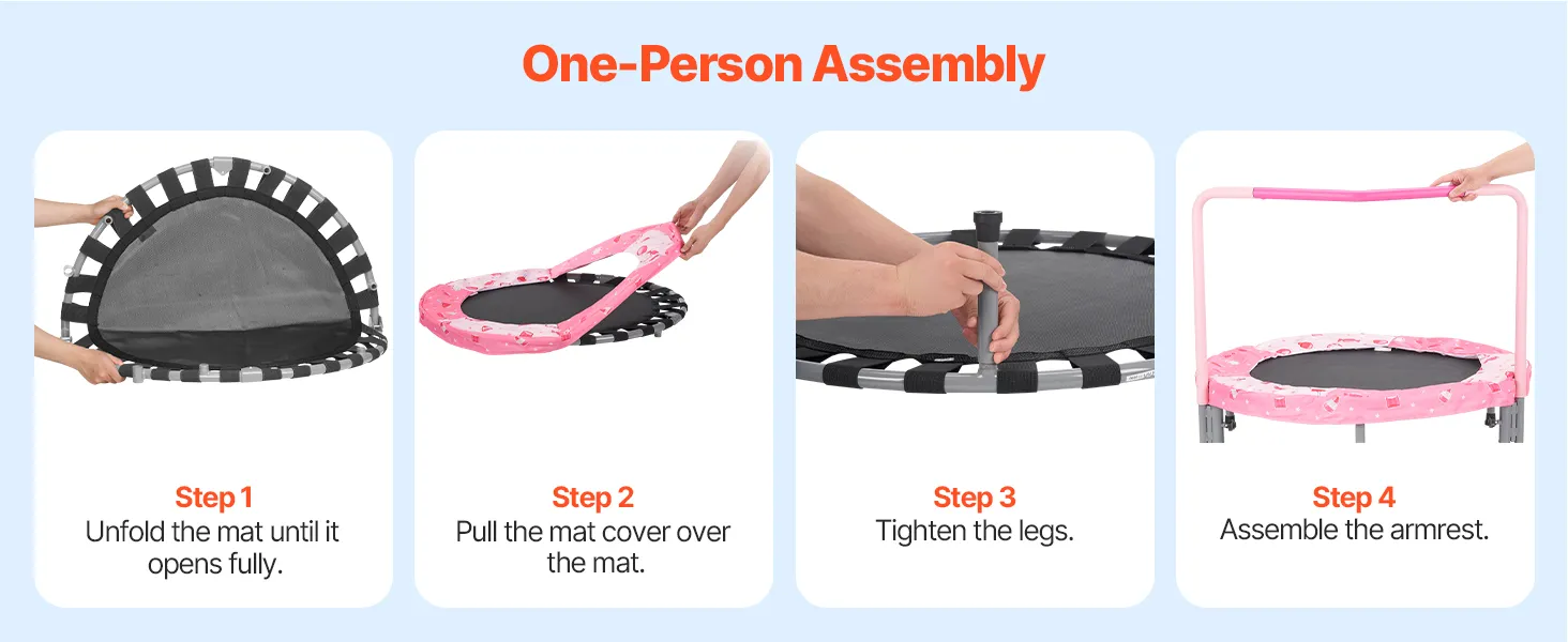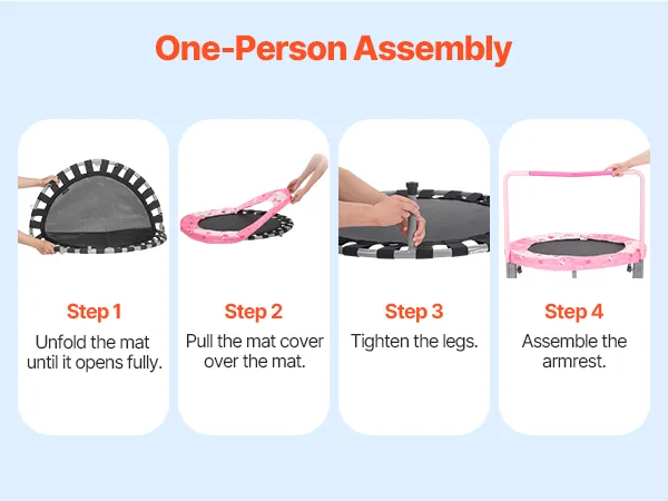 Er is slechts één volwassene nodig om de baby-peutertrampoline in elkaar te zetten. Volg de instructies om het frame in elkaar te zetten, de voeten te bevestigen en de mat aan het veerframe te bevestigen. De montagegaten en schroefdraad zijn ontworpen voor installatie in één stap.