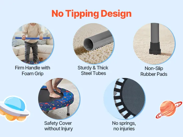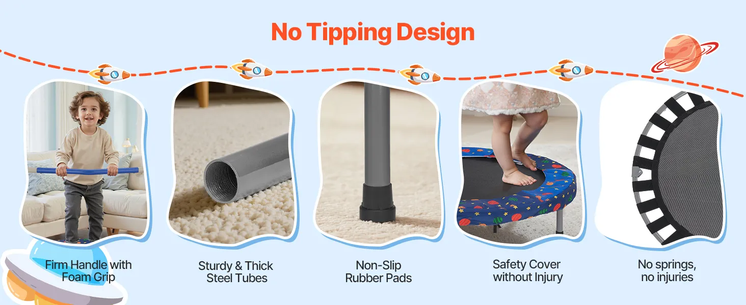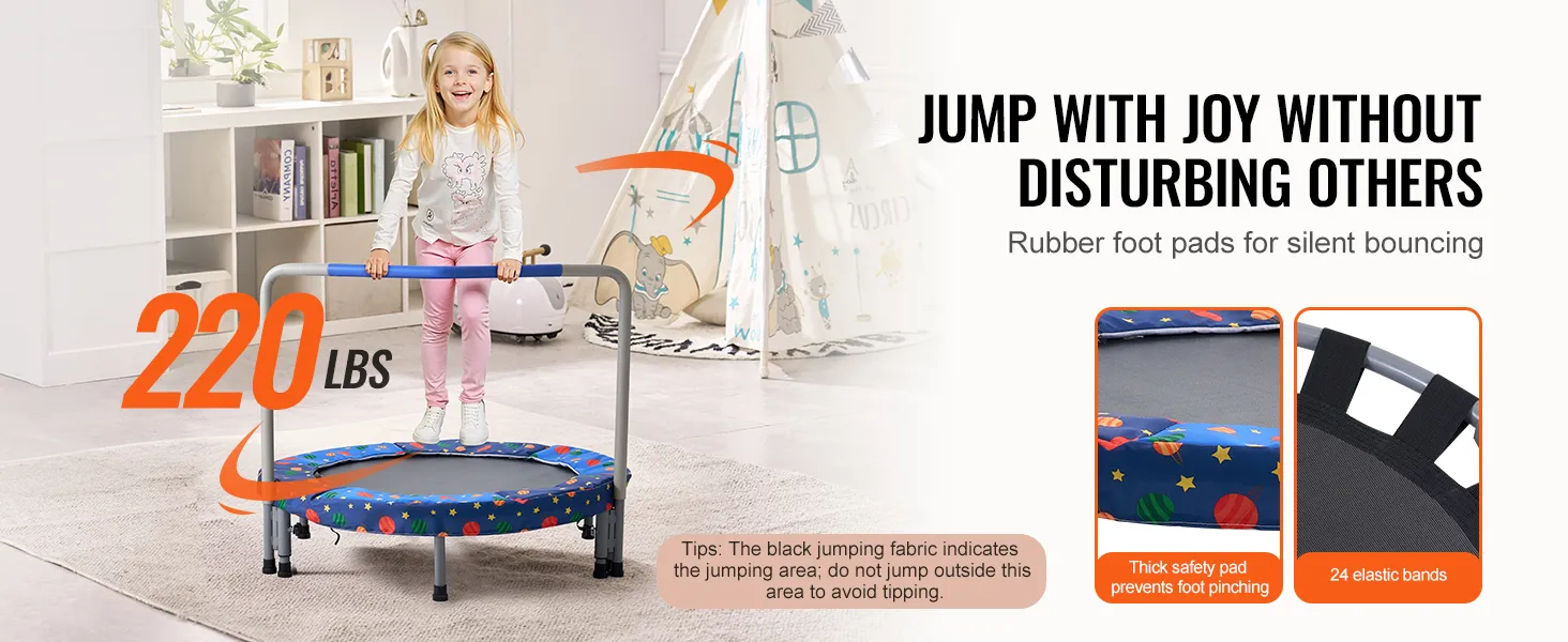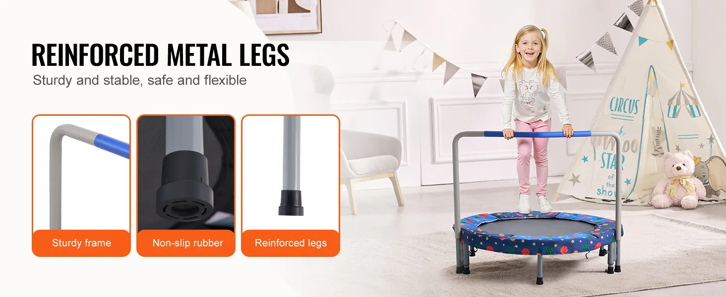 Versterkte poten: deze mini-trampoline voor peuters is uitgerust met een stevig frame, PP-springmat, veiligheidskussens, platte elastische banden, beenbuizen met rubberen uiteinden en met schuim beklede handgrepen en is gebouwd om lang mee te gaan. De nieuw verbeterde, versterkte poten zijn bestand tegen buigen en vervormen en zorgen voor een stevige stabiliteit. De rubberen voetkussens zorgen voor geruisloos springen.