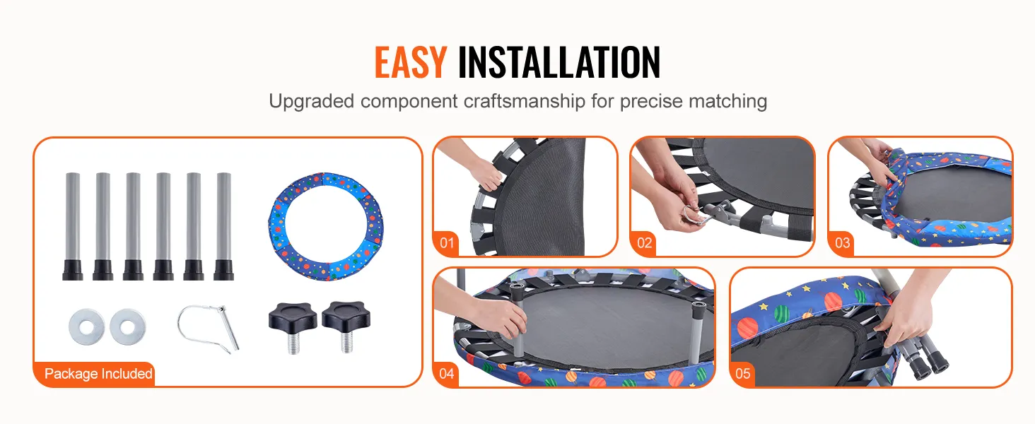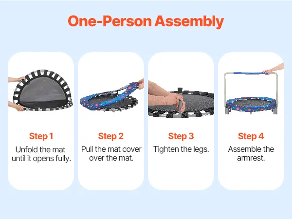 Er is slechts één volwassene nodig om de baby-peutertrampoline in elkaar te zetten. Volg de instructies om het frame in elkaar te zetten, de voeten te bevestigen en de mat aan het veerframe te bevestigen. De montagegaten en schroefdraad zijn ontworpen voor installatie in één stap.