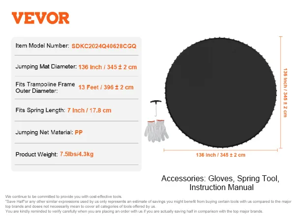 PAST TRAMPOLINE-MAAT: De vervangende trampolinemat is geschikt voor ronde trampolines met een diameter van 13 voet (396 cm), met 80 V-ringen, 7 inch (17,8 cm) veren en een matdiameter van 136 inch (345 cm). Let op: Frame en veren zijn niet inbegrepen.