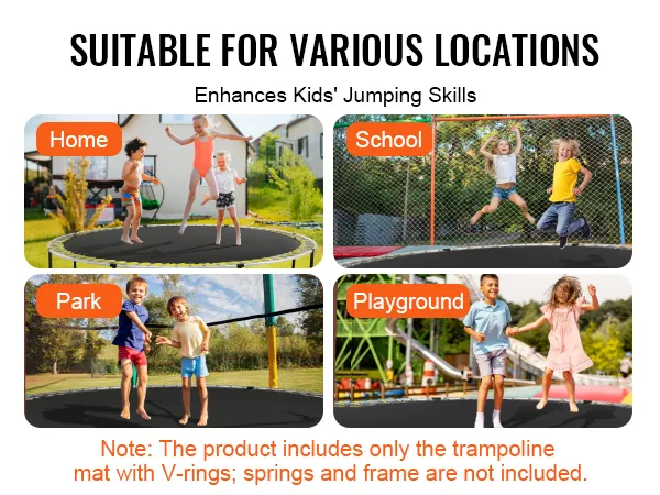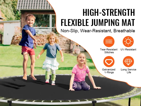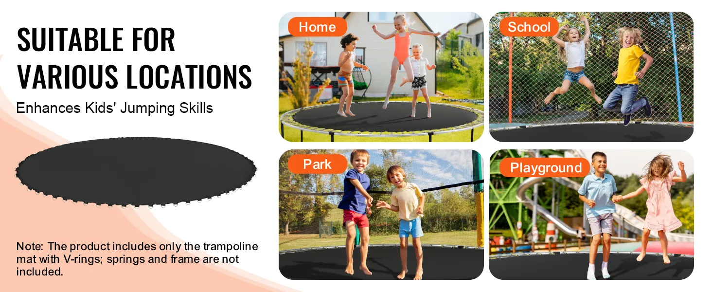 Deze hoogwaardige ronde trampolinemat wordt veel gebruikt in trampolines thuis, op scholen, parken en speelplaatsen en helpt de springvaardigheden van kinderen te verbeteren.