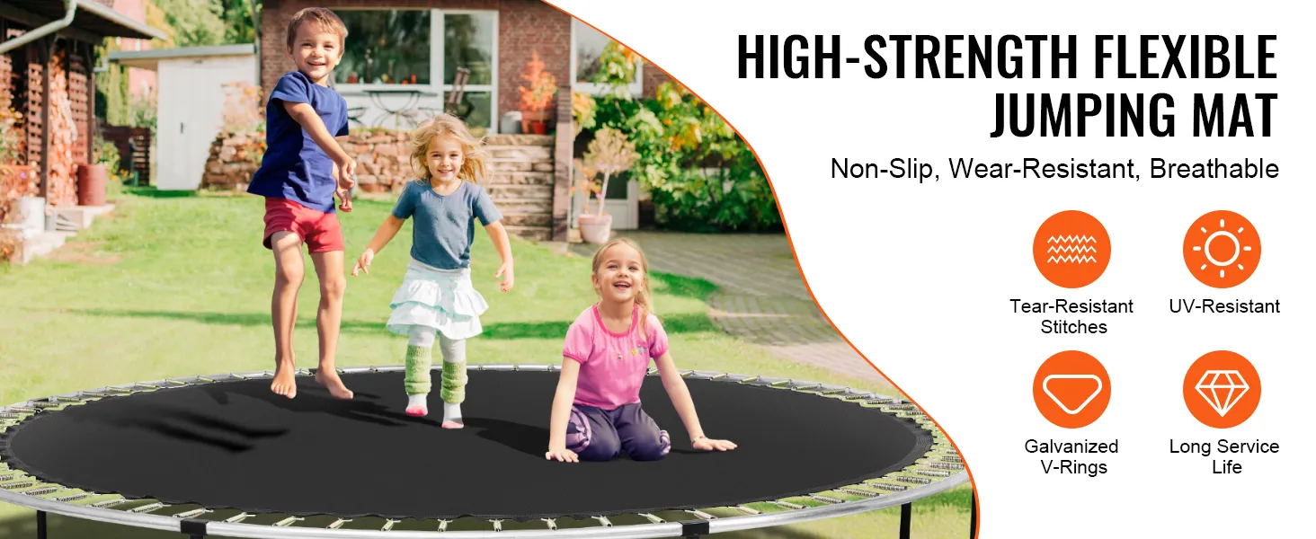 Hoogwaardig en duurzaam materiaal: onze trampoline-springmat is gemaakt van PP-materiaal met een strak geweven constructie en biedt een hoge sterkte, flexibiliteit, slipweerstand, slijtvastheid en UV-bestendigheid voor een lange levensduur. Het beschikt over dikkere stalen ringen en een hoger aantal steken om ervoor te zorgen dat de V-ringen veiliger zijn.