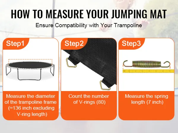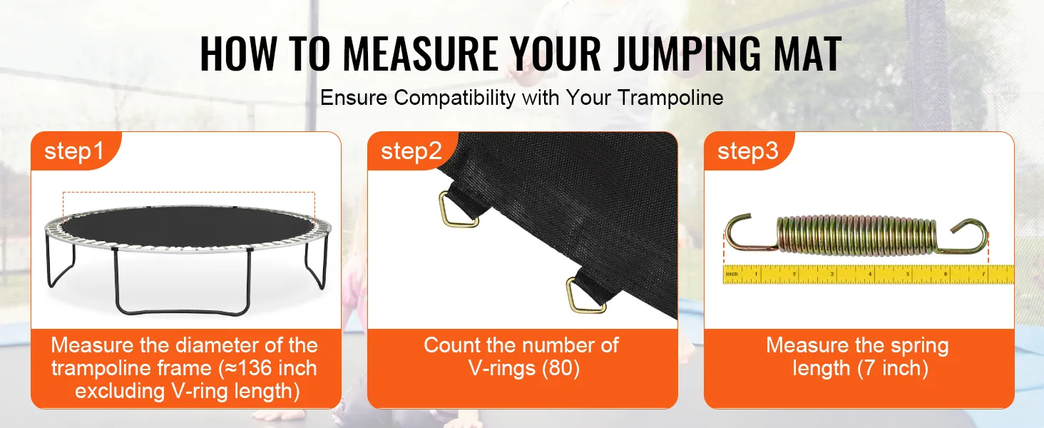 Zo bepaal je de compatibiliteit: 1. Meet de diameter van de originele trampolinemat (exclusief V-ringlengte). 2. Tel het aantal V-ringen op de originele trampoline. 3. Meet de veerlengte.