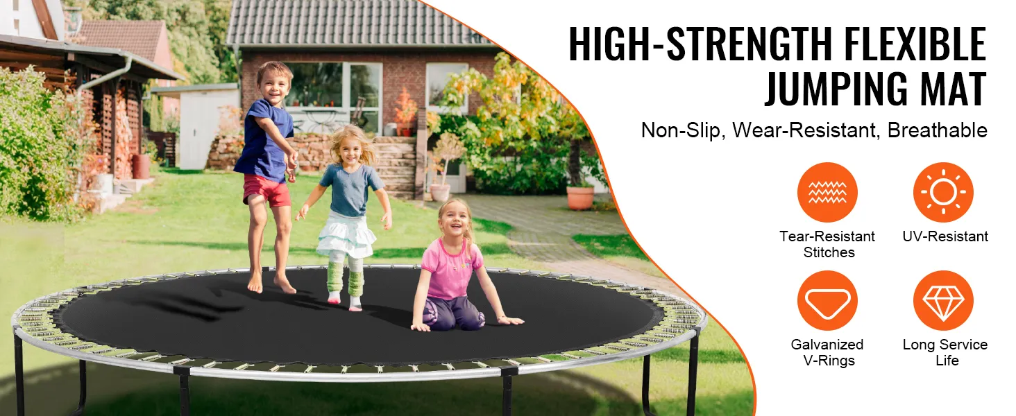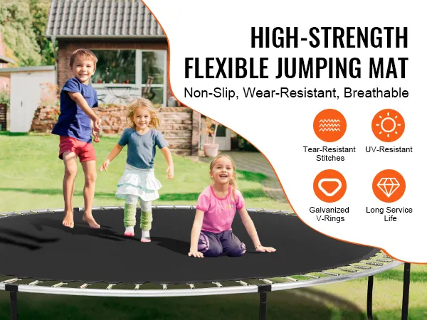 Hoogwaardig en duurzaam materiaal: onze trampoline-springmat is gemaakt van PP-materiaal met een strak geweven constructie en biedt een hoge sterkte, flexibiliteit, slipweerstand, slijtvastheid en UV-bestendigheid voor een lange levensduur. Het beschikt over dikkere stalen ringen en een hoger aantal steken om ervoor te zorgen dat de V-ringen veiliger zijn.