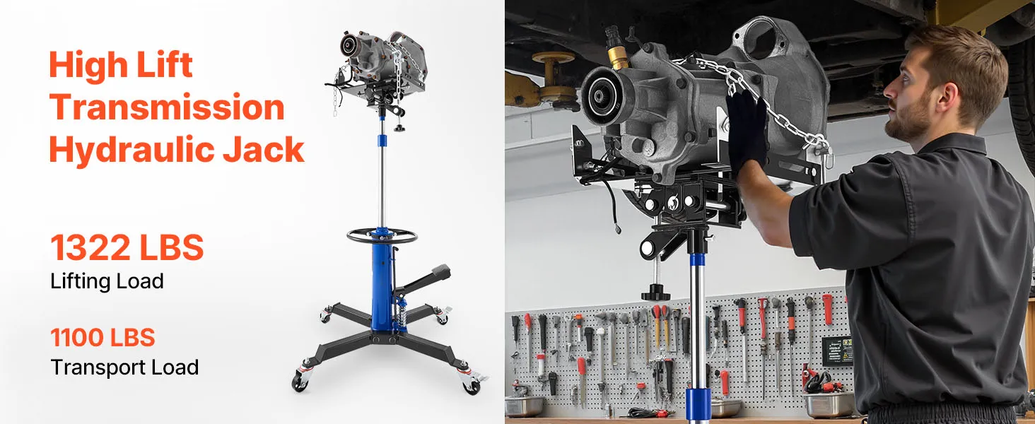 Heavy Load Capacity: The hydraulic transmission jack features a heavy-duty steel structure with a lifting capacity of 1322 lbs / 600 kg and a transport capacity of 1100 lbs / 500 kg, easily lifting transmissions, drive shafts, and axles while maintaining reliable operation