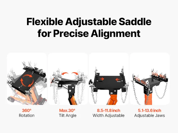 Verstelbare breedte: De transmissie-jackadapter heeft een verstelbare plaatbreedte van 8,5 tot 11,8 inch (215 tot 300 mm) en een klauwbreedte van 5,1 tot 13,6 inch (130 tot 345 mm), waardoor verschillende transmissiematen veilig kunnen worden vastgezet