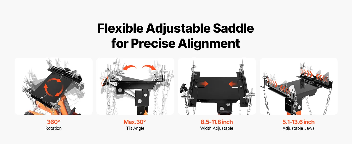 Verstelbare bak: Deze transmissie-aansluitadapter maakt 360° rotatie en tot 30° kanteling mogelijk, wat zorgt voor een nauwkeurige uitlijning van de transmissie. Het ontwerp verbetert de installatienauwkeurigheid en stabiliteit tijdens veeleisende onderhoudswerkzaamheden.