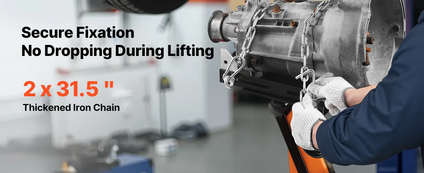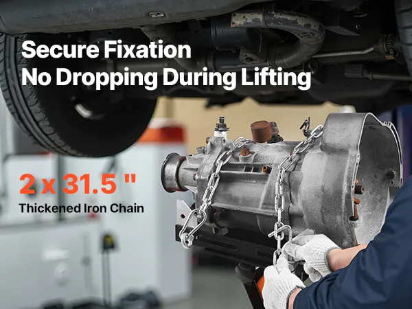 Kettingbevestiging: Deze transmissie-aansluitadapter wordt geleverd met twee extra lange, robuuste kettingen van elk 800 mm (31,5 inch) lang, die een stevige bevestiging bieden voor grote transmissies en stabiliteit garanderen tijdens transport.