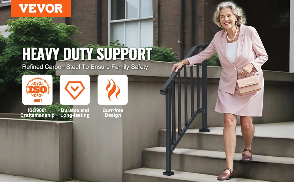 VEVOR Buitentrapleuningen, 2-3 treden trapleuningset, overgangsleuning van koolstofstaal met montageset, trapleuning voor senioren, betonnen treden, veranda en terras, zwarte retroboog