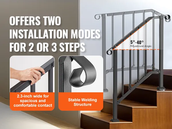 Suitable for 2-3 Step Levels: With an adjustable angle ranging from 5 to 40 degrees, this handrail is perfect for accommodating 2-3 step levels. It is ideal for various applications such as doorsteps, garage entrances, and garden railings, ensuring a versatile fit.