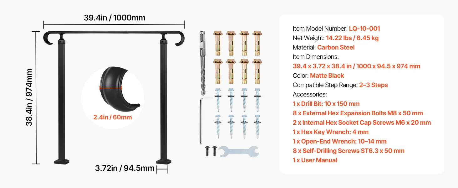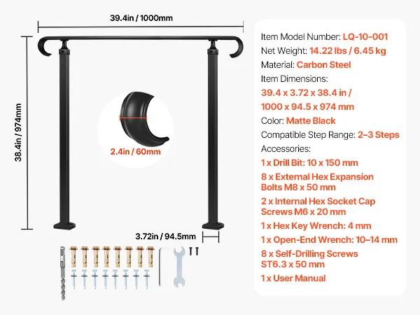 Eenvoudige installatie: Deze buitentrapleuning is voorzien van expansiebouten voor dubbele versteviging en verhoogde stabiliteit. De meegeleverde instructies begeleiden u door het installatieproces, waardoor het snel en eenvoudig is.
