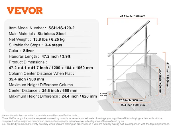 VEVOR Handrails for Outdoor Steps, 47.2in Length 2 Crossbars Stair Hand Rail Kit, Transitional Stainless Steel Railings w/ Installation Kit, Double-column Staircase Handrails for Seniors,Porch & Deck VEVOR Handrails for Outdoor Steps, 47.2in Length 2 Crossbars Stair Hand Rail Kit, Transitional Stainless Steel Railings w/ Installation Kit, Double-column Staircase Handrails for Seniors,Porch & Deck