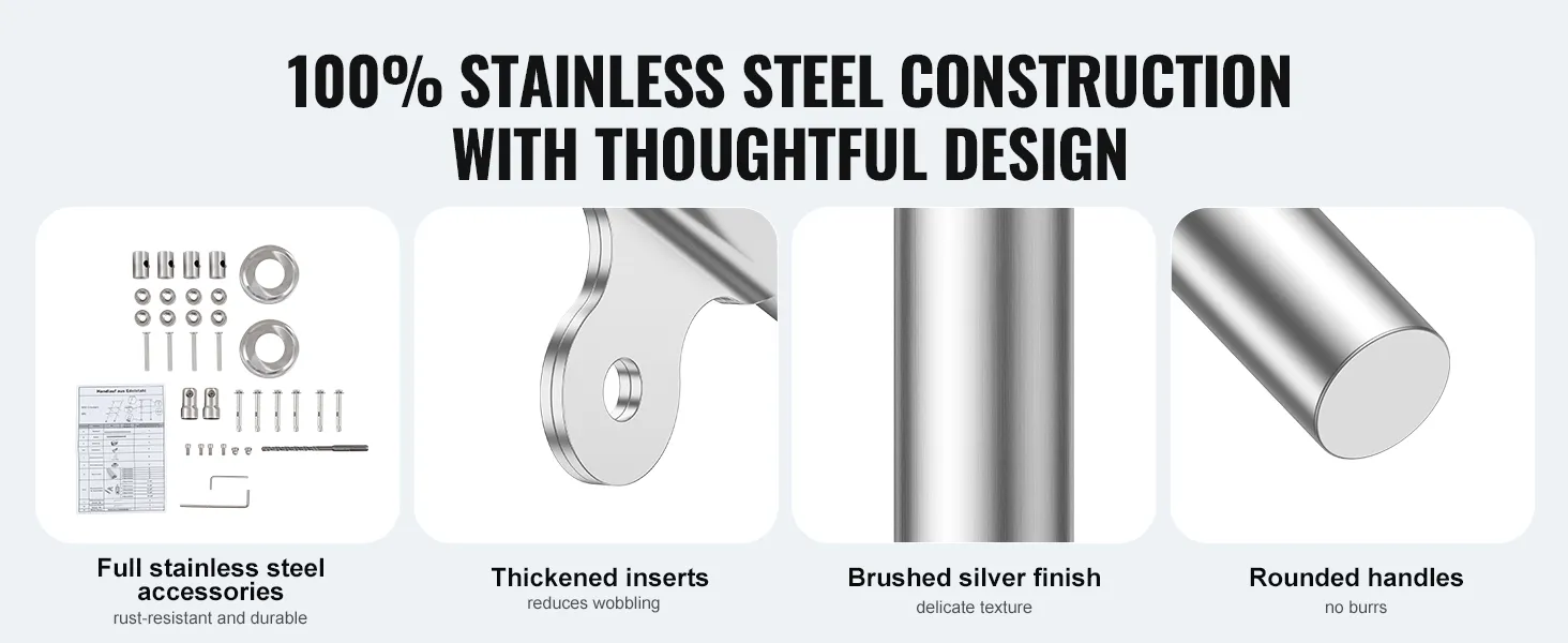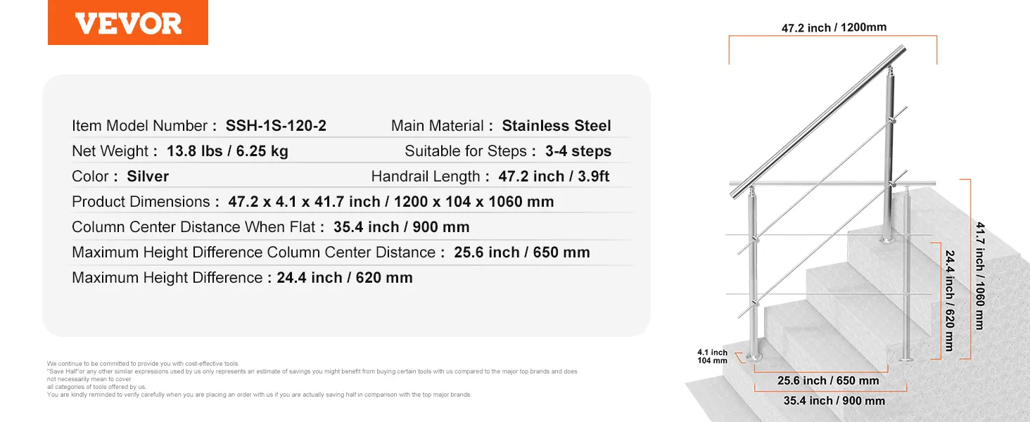 • Friendly Reminder: This handrail is made of 201 stainless steel and may have a potential risk of rusting outdoors. Please confirm installation space before purchase. Use a blue Scotch Brite pad to clean rust if needed