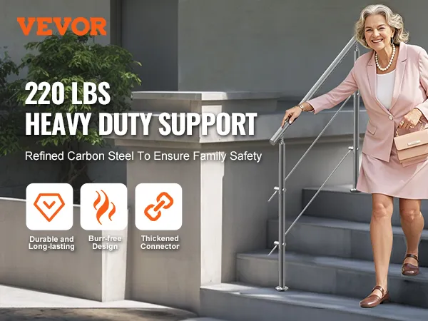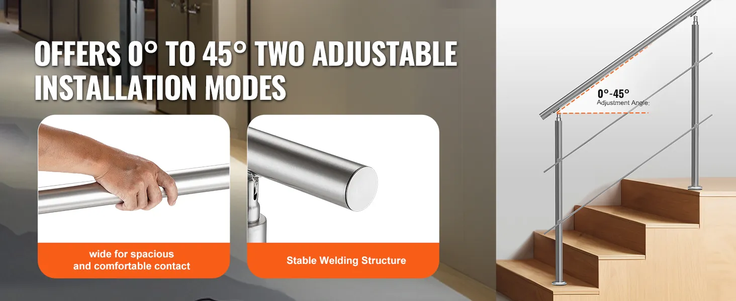 • 220 lbs Heavy-Duty Capacity: This stair handrail is built to last, offering reliable safety and support for both the elderly and children. Its reinforced design provides a comfortable grip, ensuring secure use for pregnant women and seniors as they navigate stairs. 0°-45° Adjustable Angle: The handrail features an adjustable range from 0 to 45 degrees, making it ideal for most doorsteps, garage entrances, garden railings, and more. This flexibility allows it to accommodate various stair configurations effectively.