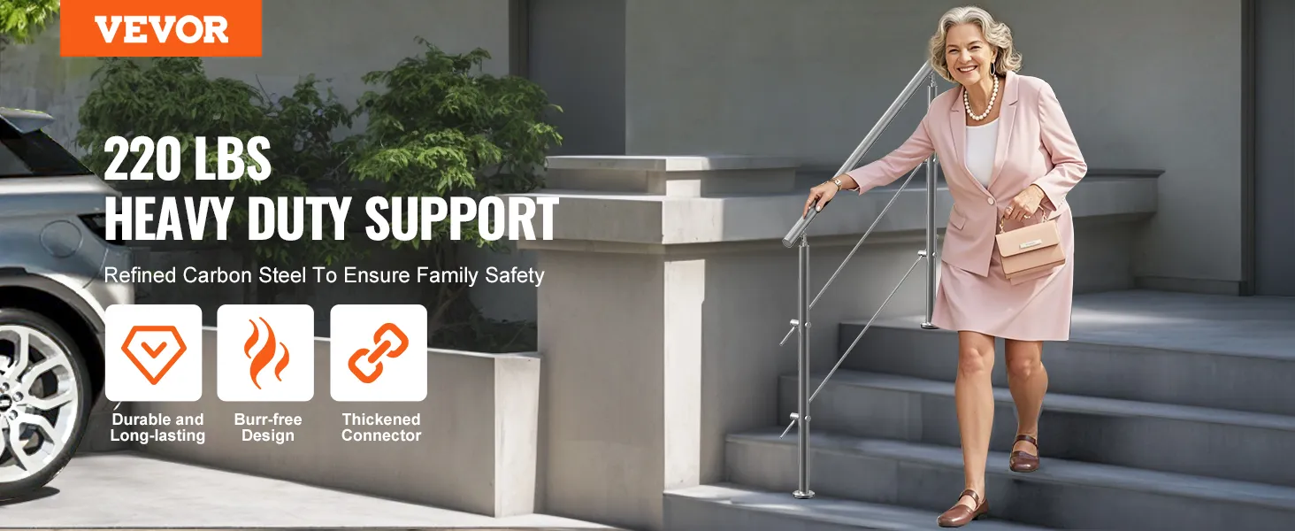 • Versatile Use: This outdoor stair railing can be installed on concrete, wood floors, tiles, marble, and other solid surfaces. Its unique design complements various stair types, ensuring both functionality and style.