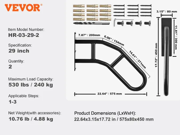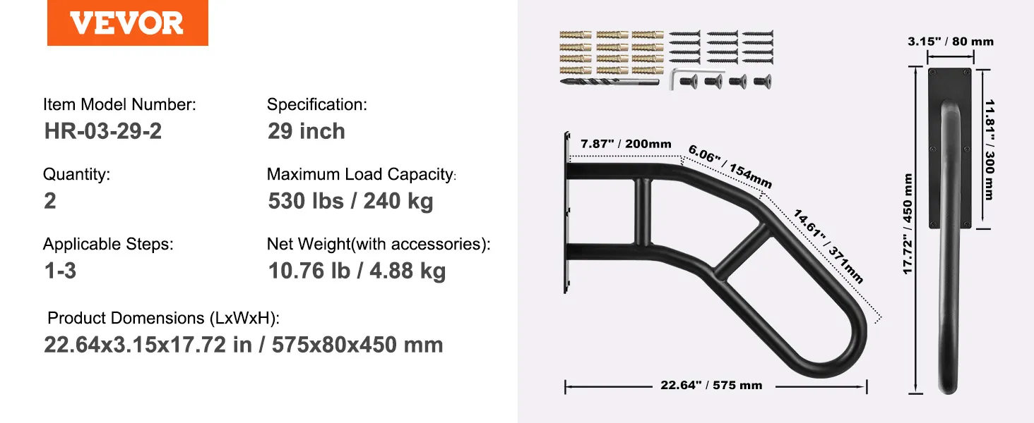 Geschikt voor 1-3 treden: deze 29 inch lange aan de muur gemonteerde leuning is perfect voor 1-3 treden, met een rechte rand van 20 cm (7,87 inch), een afgeschuinde rand van 15 cm (6,06 inch) en een schuine rand van 14,61 inch. inch (37 cm). Het is ideaal voor de meeste garages, tuinen, gangen en meer.