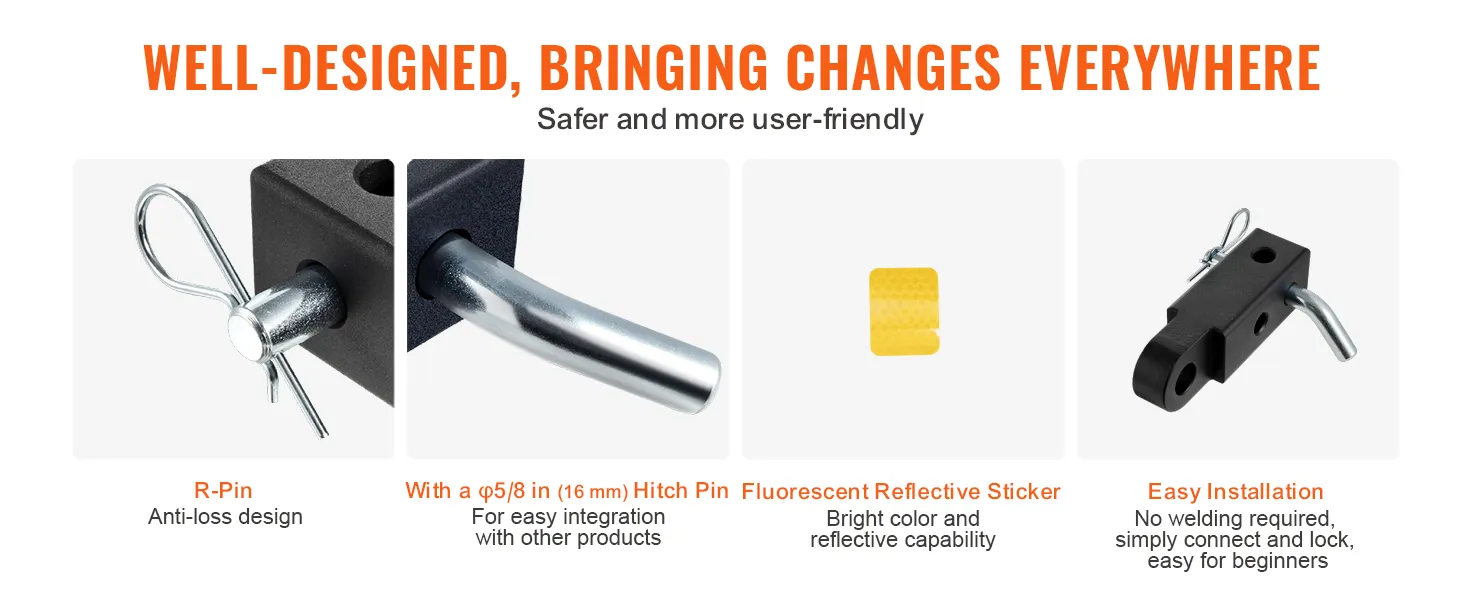 Enhanced Details: Get your shackle trailer hitch up and running in no time—no welding or complex tools needed! Just connect the shackle, and you're set. Enhanced security features like a bright reflective sticker improve visibility and security at night.