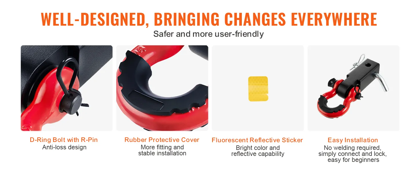 Enhanced Details: Get your shackle trailer hitch up and running in no time—no welding or complex tools needed! Just connect the shackle, and you're set. Enhanced security features like a D-ring bolt with an R-pin and a bright reflective sticker improve visibility and security at night.