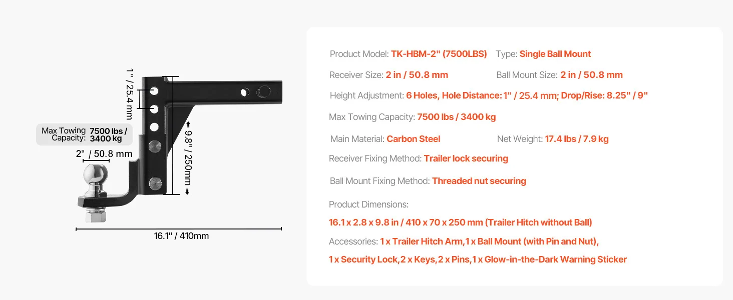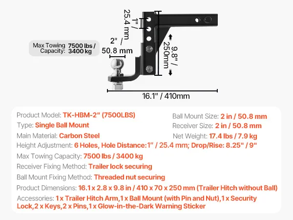 Up to 7,500 lbs Towing Capacity: Our ball mount hitch is made from heavy-duty carbon steel, ensuring security and reliability during towing, capable of withstanding high towing forces. After professional testing, the 2 in/50 mm ball mount is rated for a 7500 lbs / 3400 kg towing capacity. The detachable and replaceable ball head design provides flexibility for transporting various heavy-duty trucks or RVs.