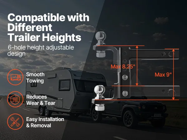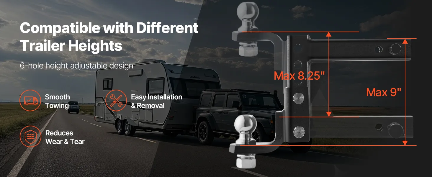 The trailer hitch quickly achieves a drop depth of 9 in / 22.9 cm and an elevation height of 8.25 in / 21 cm with 6 adjustment holes, allowing you to tailor the connection to the required height for different vehicles.