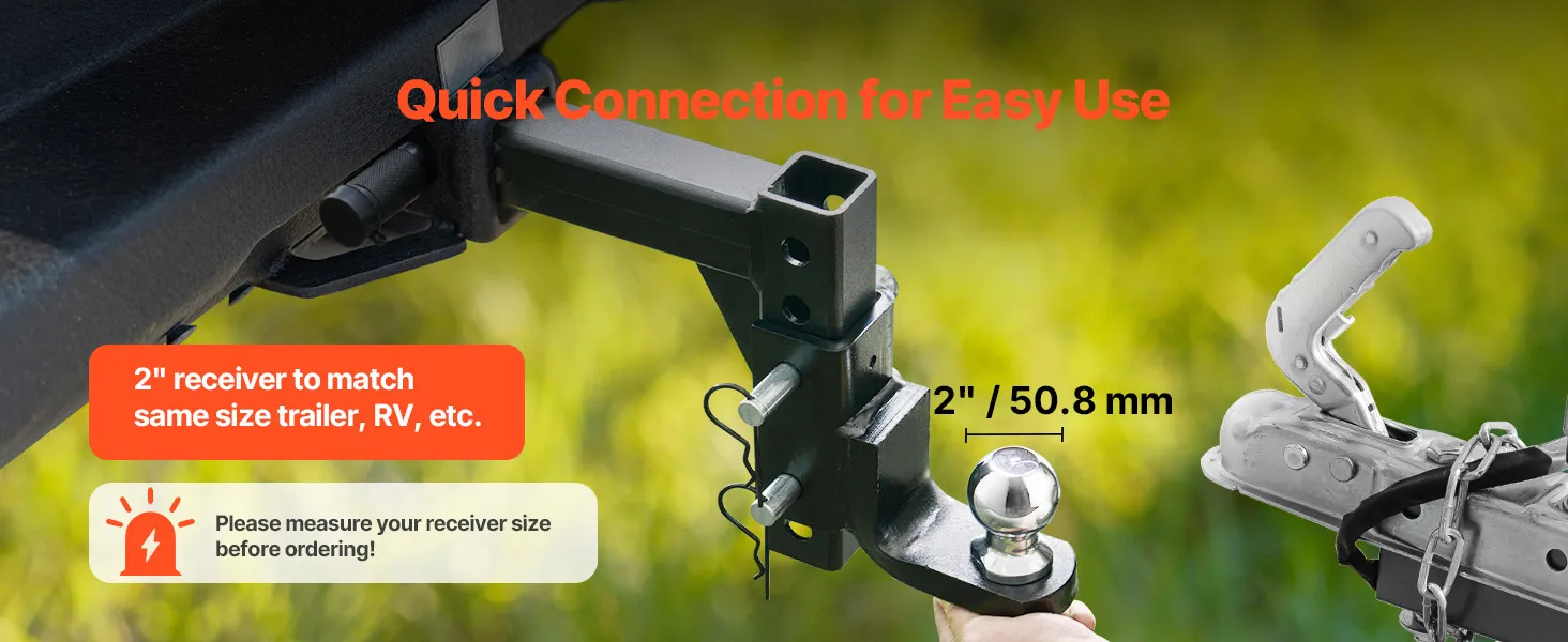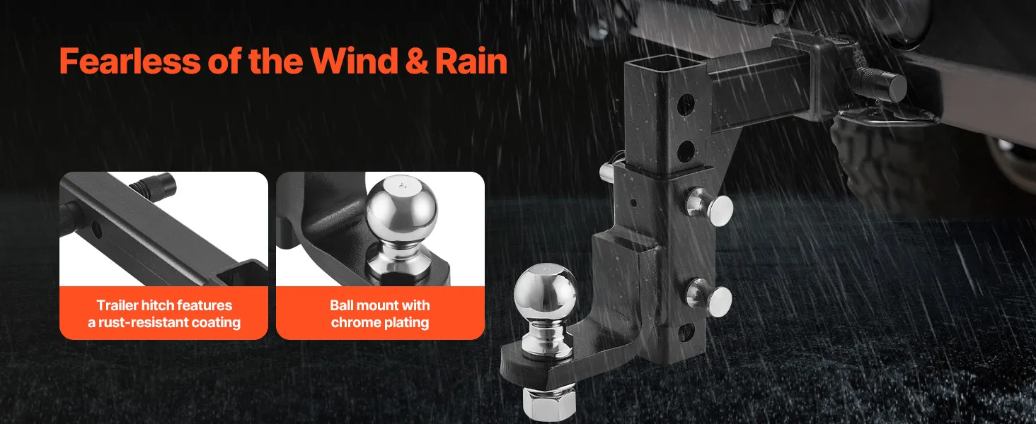 Corrosion-Resistant & Weatherproof: For long-lasting use, the heavy duty trailer hitch is coated with an anti-rust layer, and the ball head is treated with a chrome-plated finish. The corrosion-resistant materials can withstand outdoor weather conditions like rain, sun exposure, and dust. Whether in hot summers or cold winters, it remains in optimal condition.