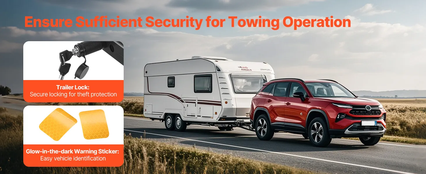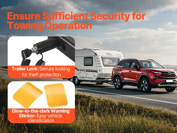 The trailer lock securely locks the equipment, avoiding the heavy duty hitch from accidentally disconnecting and also acting as an anti-theft measure. The glow-in-the-dark warning sticker ensures security for nighttime outdoor activities.