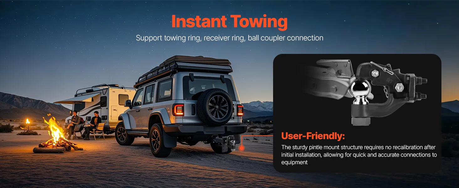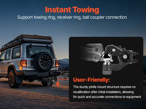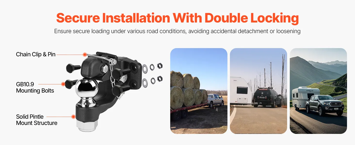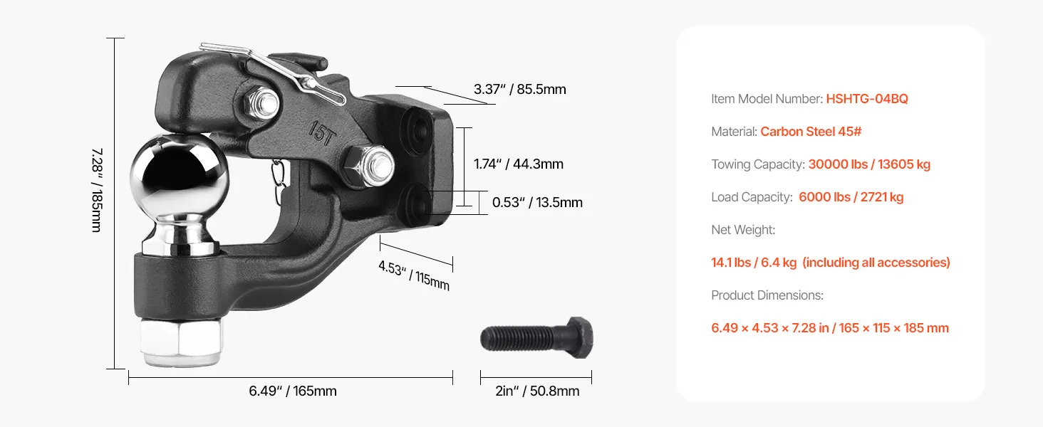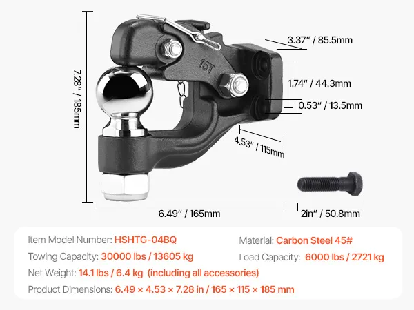 Hoog draagvermogen: onze penkoppeling ondersteunt treklasten tot 30.000 lbs / 13.605 kg en heeft een verticale draagkracht van 6.000 lbs / 2.721 kg. De trekhaak heeft een kogelmaat van 2-5/16 inch en kan worden bevestigd aan ringen van 2,5 tot 3 inch (6,35 tot 7,62 cm), waardoor het vervoeren van zware apparatuur en vracht eenvoudiger wordt.