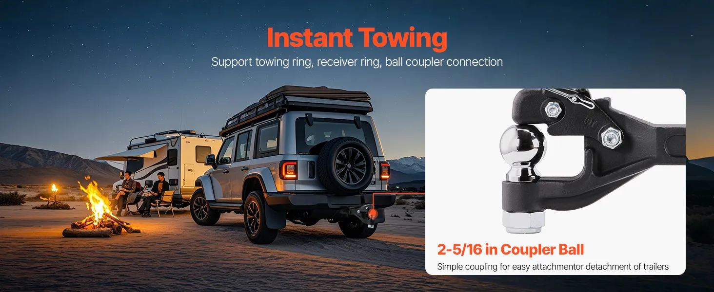 High Load Capacity: Our pintle hitch supports towing loads of up to 20,000 lbs, with a vertical load capacity of 4,000 lbs. It is compatible with 2" connection receivers, featuring a 2-5/16" hitch ball, and can connect to 2.5" - 3" lunette rings, making it easy to transport heavy equipment and cargo.
