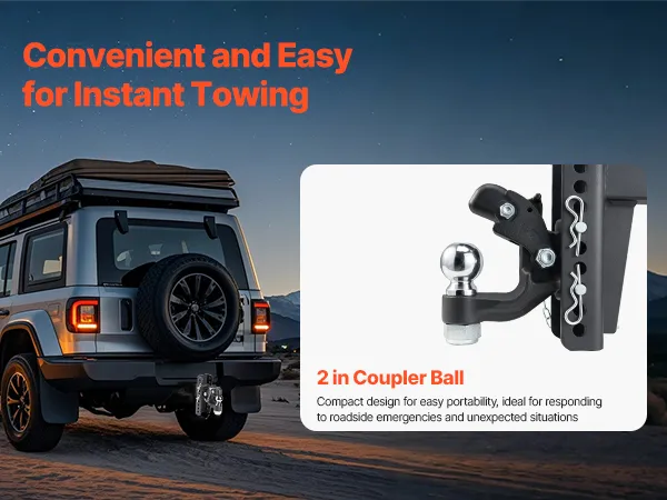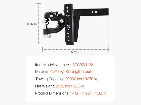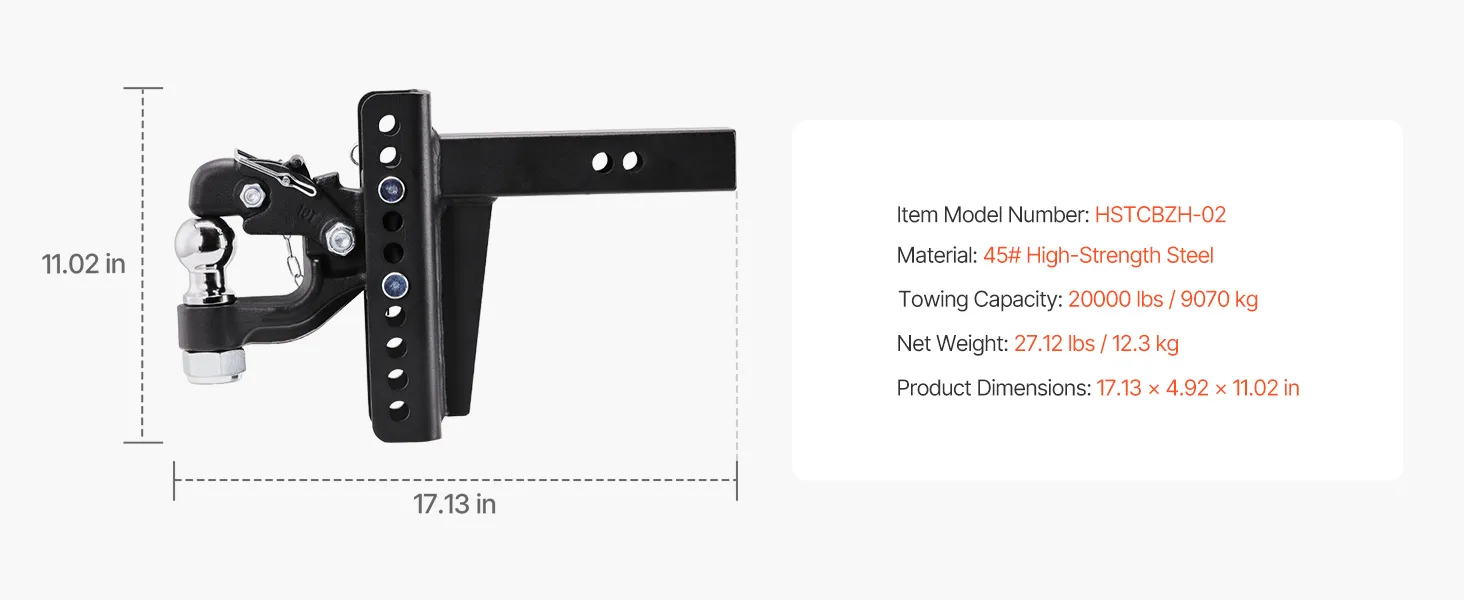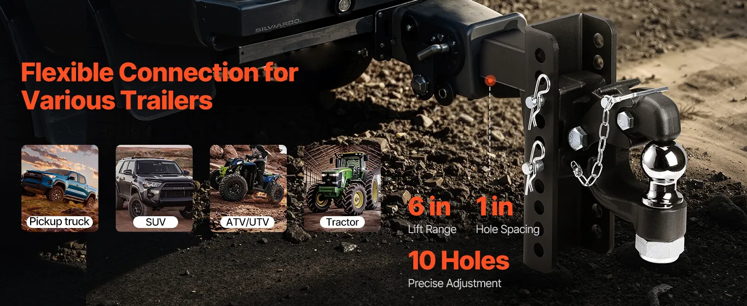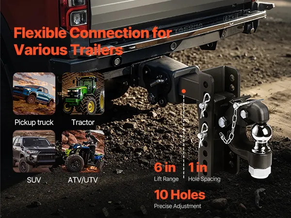 • Wide Compatibility: The 10-hole height adjustment design allows for a 6" range of rise and fall, accommodating various road conditions and vehicle heights. With a standard 2" connection receiver, our pintle hook can easily pair with lunette rings, receiver rings, and ball couplers, making it compatible with trucks, tractors, SUVs, and ATVs.