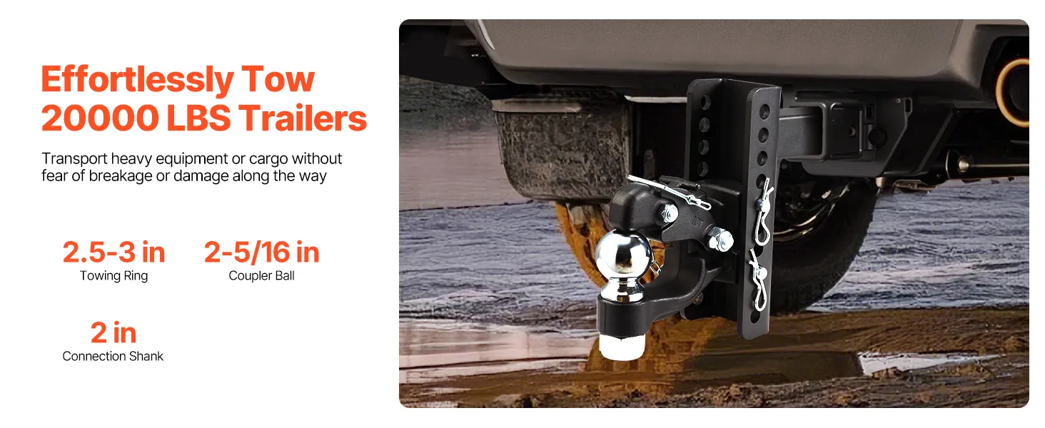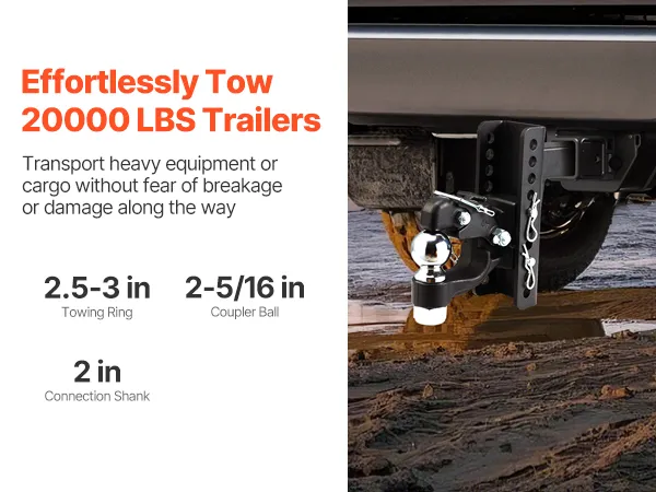 • High Load Capacity: Our pintle hitch supports towing loads of up to 20,000 lbs. It is compatible with 2" connection receivers, featuring a 2-5/16" hitch ball, and can connect to 2.5" - 3" lunette rings, making it easy to transport heavy equipment and cargo.