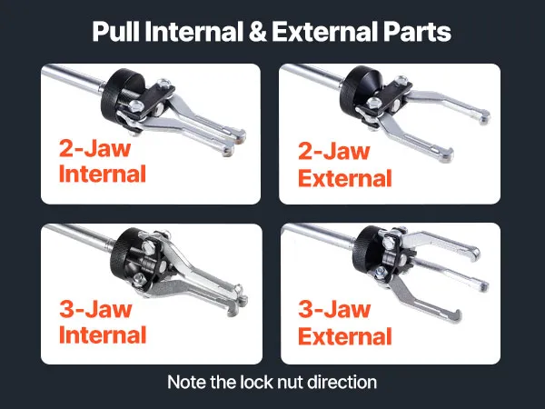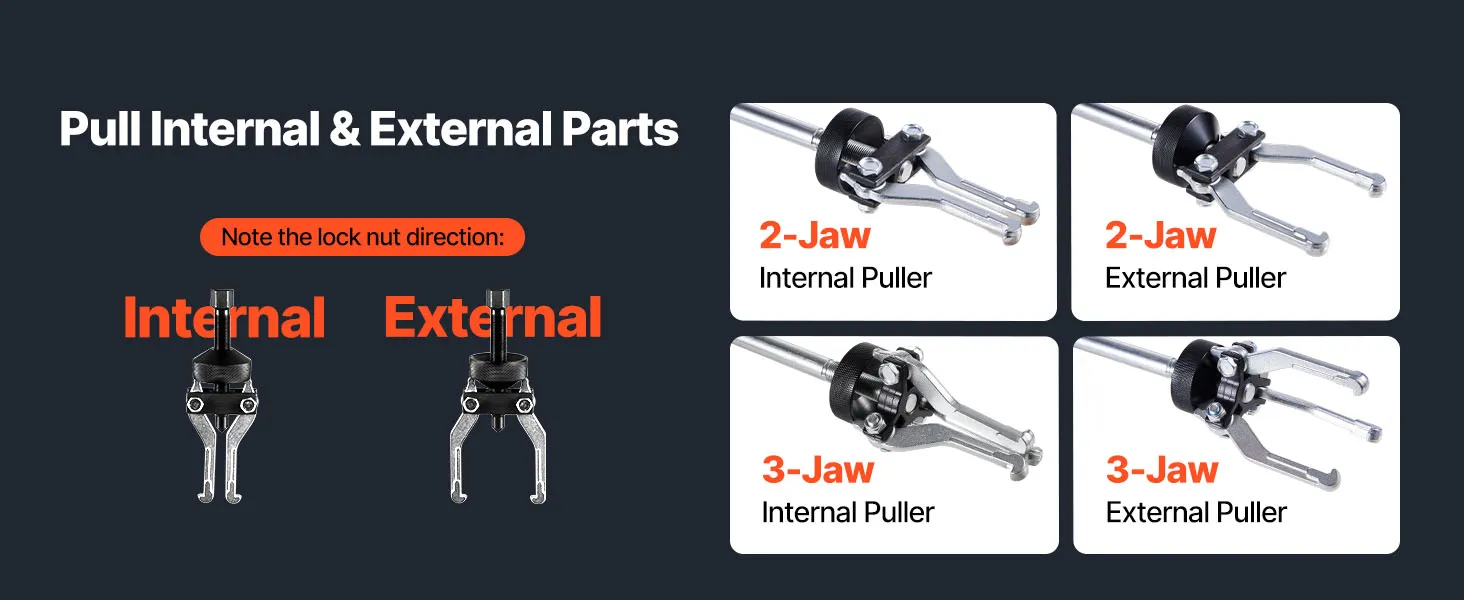 Binnen- en buitentrekkers met klauwen: deze glijhamerset bevat binnen- en buitentrekkers met 2- en 3-bekkenadapters. Hij biedt vier verschillende instellingen voor het verwijderen van lagers, keerringen en tandwielen vanuit elke hoek.