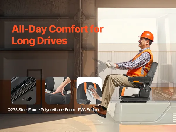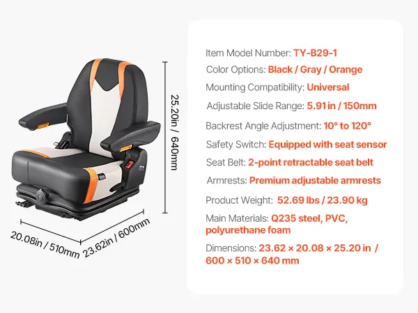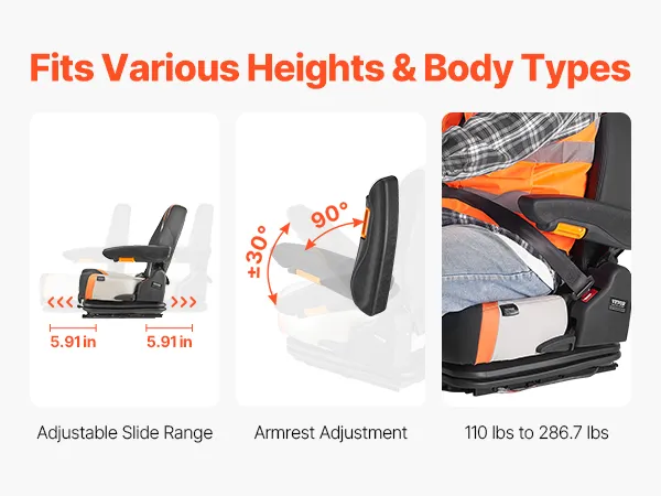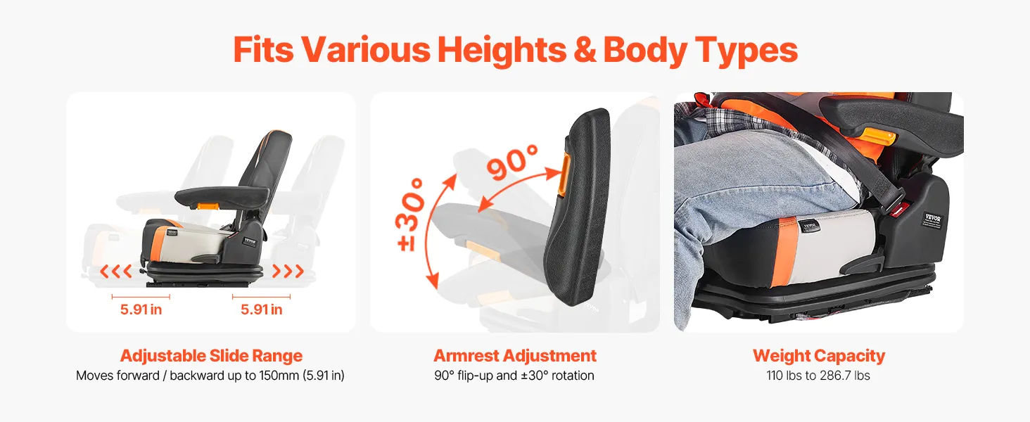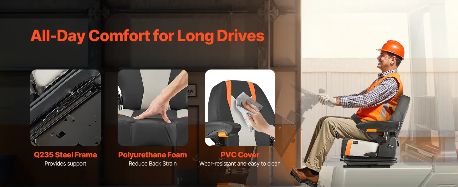Verstelbaar ophangingsontwerp: De verende heftruckstoel is voorzien van een duurzaam ophangingssysteem met schokabsorberende eigenschappen. Het compressiebereik bedraagt 45 mm, ondersteunt een gewichtsbereik van 50 tot 130 kg en kan worden aangepast aan het terrein voor een soepele rit op verschillende oppervlakken.