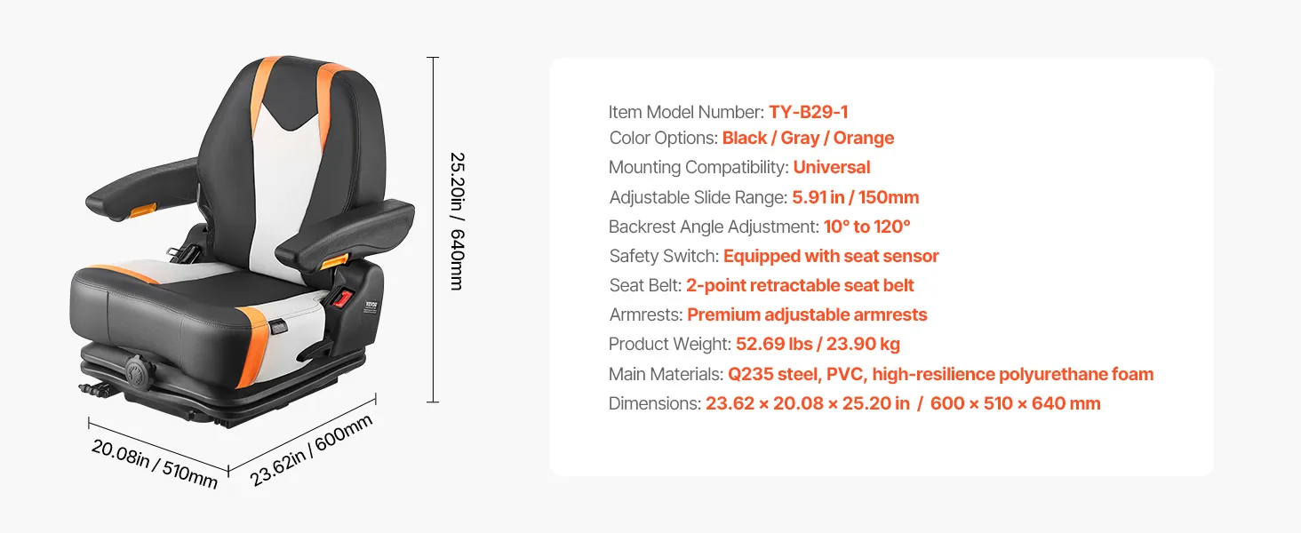 Deze stoel is ideaal voor heftrucks, grasmaaiers, tractoren en graafmachines en zorgt voor comfort en veiligheid in uiteenlopende werkomgevingen.