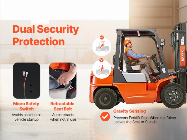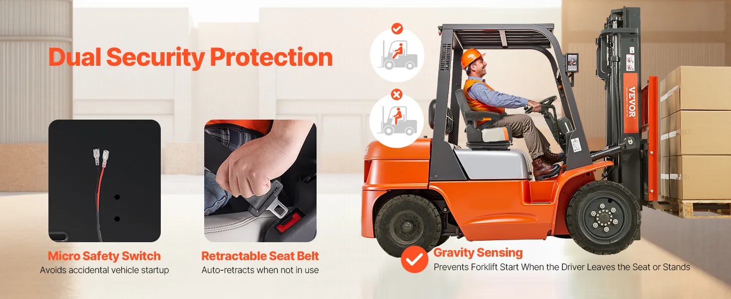 De stoel is voorzien van een microschakelaar die voorkomt dat de heftruck start als de bestuurder niet op de stoel zit, waardoor de veiligheid wordt gewaarborgd. De oprolbare veiligheidsgordel biedt bescherming tijdens het rijden en rolt automatisch op wanneer de gordel niet in gebruik is.