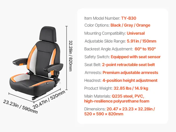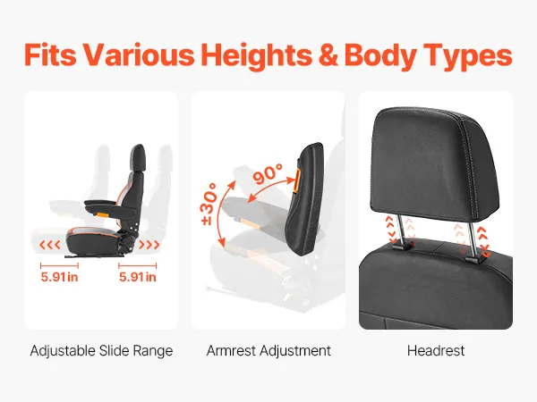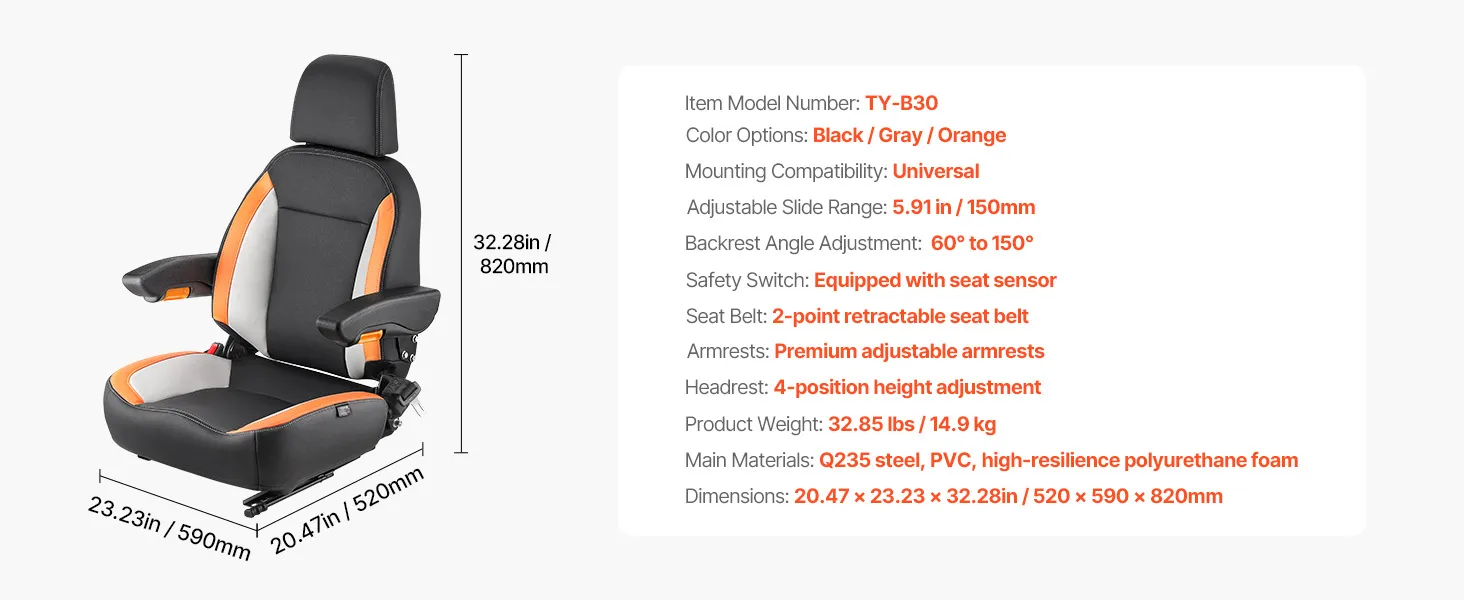 This heavy-duty forklift seat is compatible with 99% of forklift models, featuring adjustable back, armrests, and front-back movement, with a 4-level adjustable headrest to ensure comfort for drivers of all sizes. Dual safety protection design, make it suitable for forklifts and mowers.