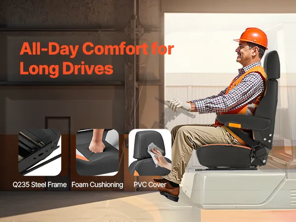 Built with a Q235 steel frame, this forklift seat offers excellent structural support. The polyurethane foam padding is soft and highly elastic, effectively reducing pressure on the driver's back and waist. The PVC outer layer is durable, wear-resistant, and easy to clean.
