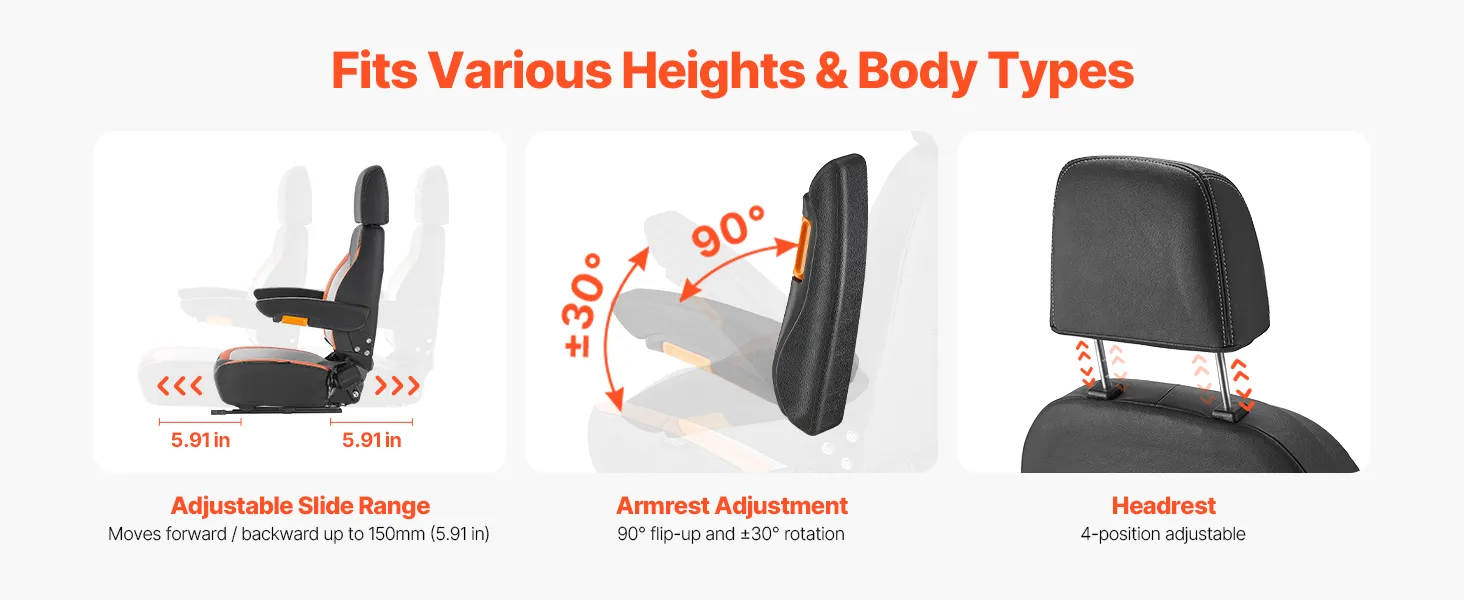 All-Around Adjustable Comfort: The zero turn forklift seat have an infinitely adjustable backrest between 60° and 150°. The armrests flip 90° and adjust vertically by 30°. The seat rail provides 5.91 inches of adjustment to ensure optimal comfort during long working hours.