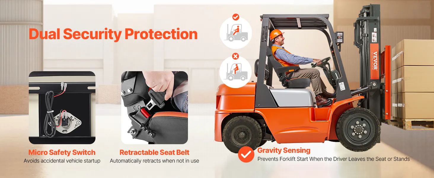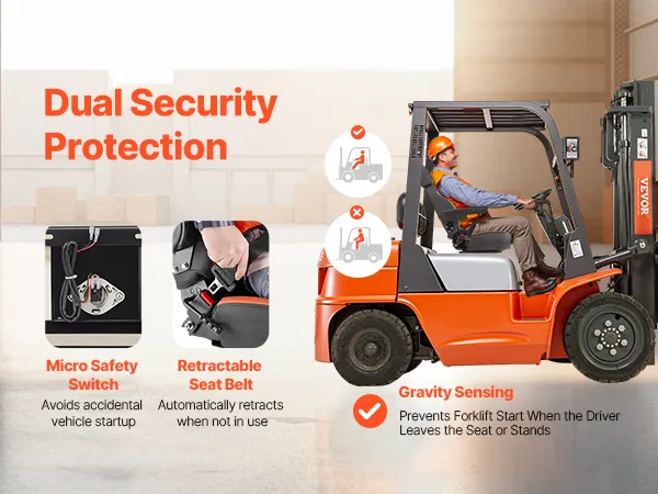 Equipped with a micro switch, the seat ensures that the forklift cannot start if the driver is not seated, preventing accidents. The retractable seat belt offers protection during operation and automatically retracts when not in use for convenience.