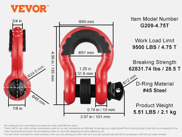 Built for Heavy-Duty Strength: Crafted from high-grade forged 45# steel, this D-ring shackle handles towing weights up to 9500 lbs/4.75T with ease.
