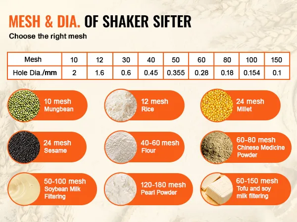 2 zeven: De trilzeefmachine wordt geleverd met twee zeven van roestvrij staal 304, maaswijdte 30 en 50. U kunt een zeef kiezen afhankelijk van uw behoeften: over het algemeen is een zeef van 30 mesh geschikt voor sesamzaad, terwijl een zeef van 50 mesh ideaal is voor meel. Wij bieden u verschillende maaswijdten aan waaruit u kunt kiezen.