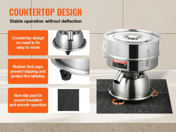 Werkplekontwerp: onze trilzeef kan zonder bevestiging overal worden geïnstalleerd, waardoor hij gemakkelijk te verplaatsen is. De rubberen voetjes en stevige antislipkussentjes verminderen het geluid, voorkomen uitglijden en beschermen oppervlakken, waardoor een stabiele en efficiënte werking wordt gegarandeerd. Dit ontwerp wordt veel gebruikt in restaurants, bakkerijen, korenmolens, huishoudelijke keukens, enz.