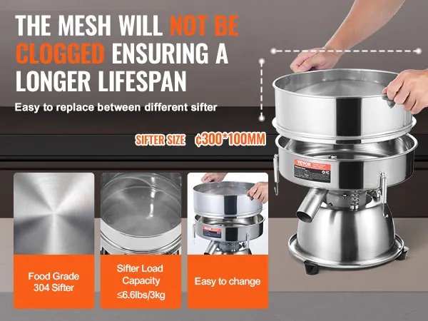 Gemakkelijk te vervangen en schoon te maken: het ontwerp met verhoogde zeef maximaliseert het gaasgebruik, vermindert het risico op verstoppingen en zorgt voor automatisch legen van materiaal bij het verwerken van grote hoeveelheden. De zeef kan maximaal 3 kg dragen en is dankzij de constructie van roestvrij staal 304 eenvoudig te vervangen en schoon te maken.
