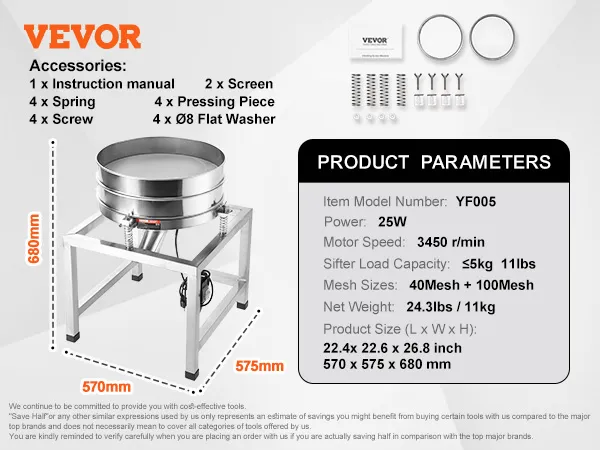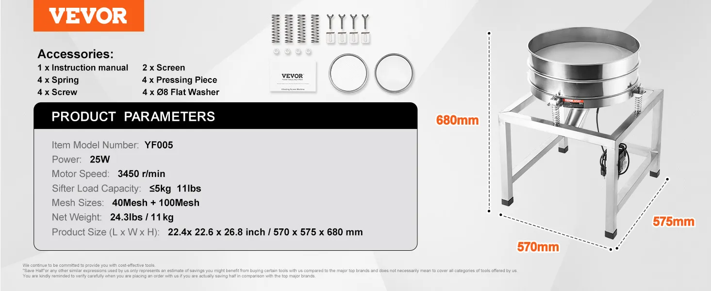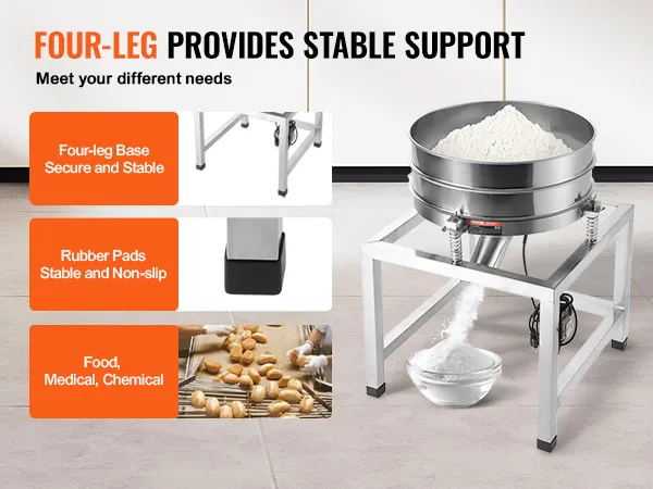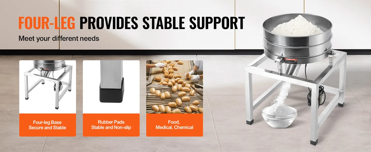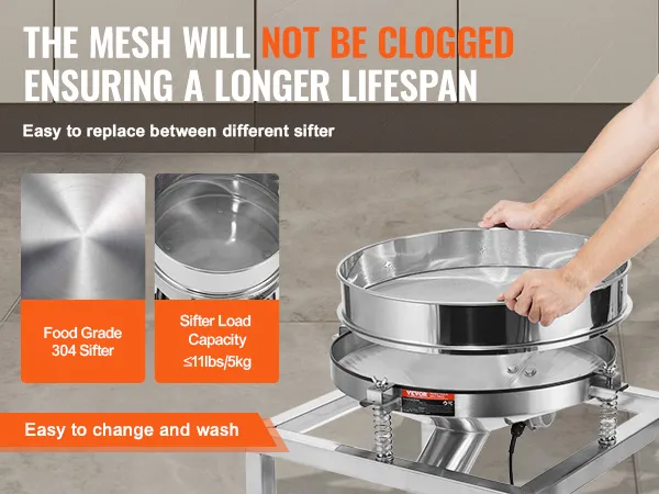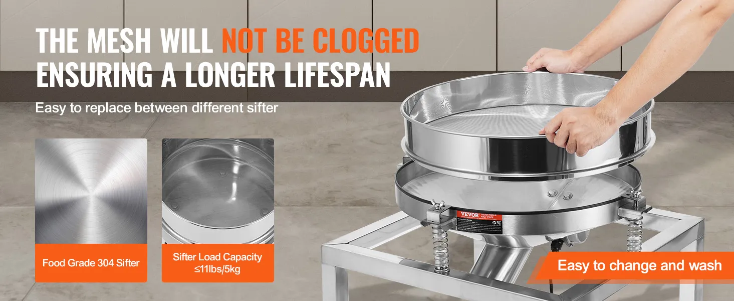 Easy to Replace and Clean: The raised sieve design maximizes mesh utilization, reduces the risk of clogging, and allows for automatic material discharge, handling large volumes. The sieve can bear up to 11 lbs / 5 kg and is easy to replace and clean, thanks to the 304 stainless steel construction.