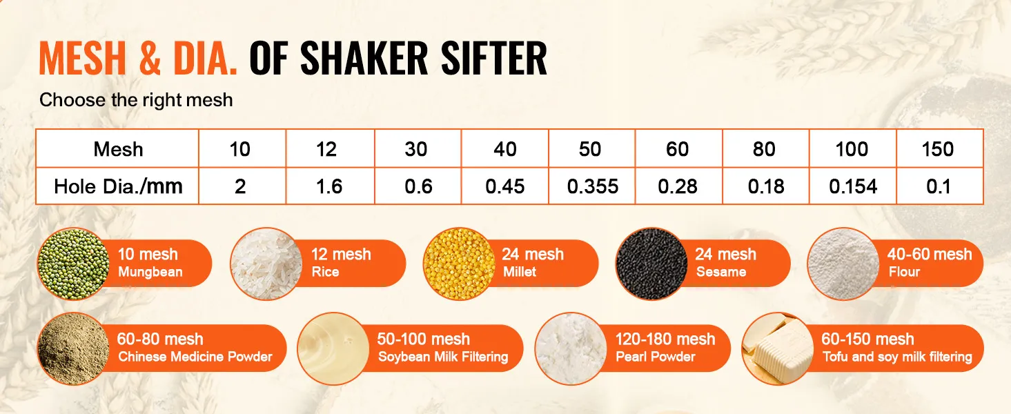 2 Types of Silter: Comes with two 304 stainless steel sifter, 40 mesh and 100 mesh. You can select one based on your needs: generally, a 40 mesh is suitable for flour, while the 100 mesh is ideal for smaller particles. We offer a variety of mesh sizes for your selection.