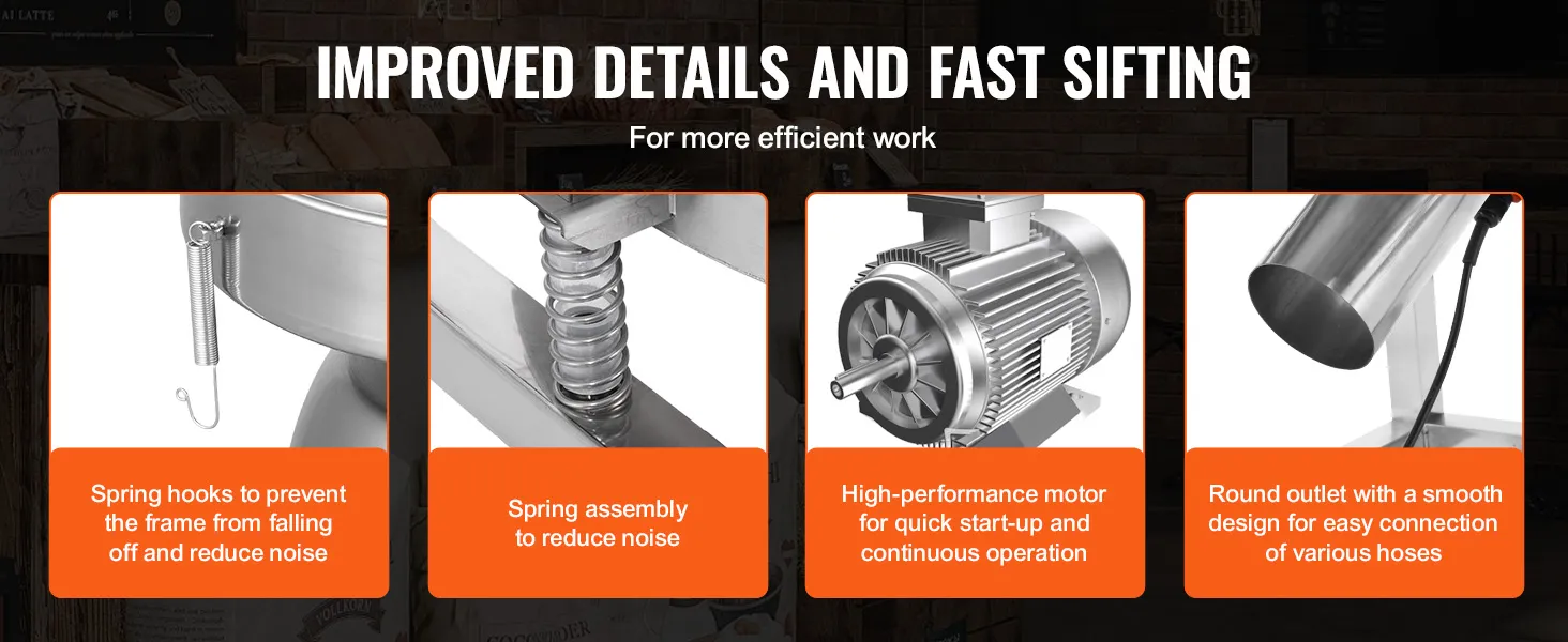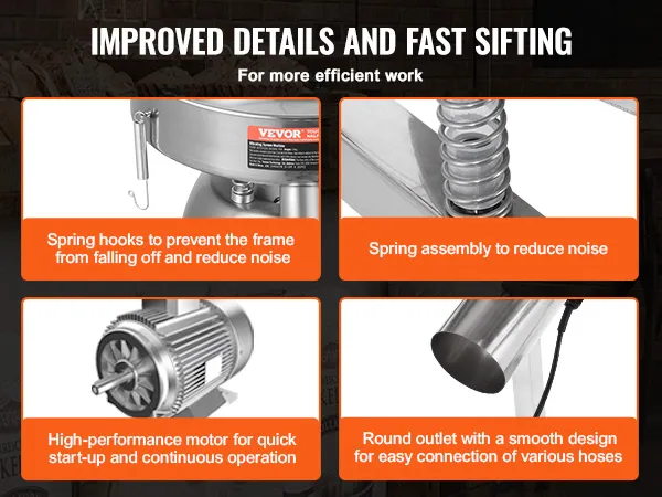 Premium Stainless Steel: Carefully selected high-quality stainless steel ensures durability, security, and hygiene, making it ideal for complex screening conditions involving powders and liquids. The stainless steel round outlet provides uniform material discharge without clogging, and it's easy to connect various hoses. Specially designed stainless steel spring hooks offer excellent elasticity and strong tension, effectively preventing the sieve frame from falling off or causing abnormal noise.