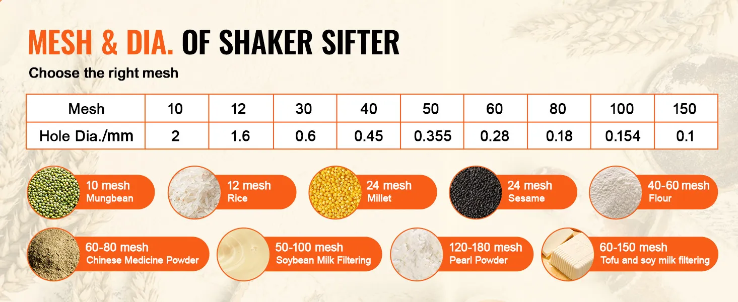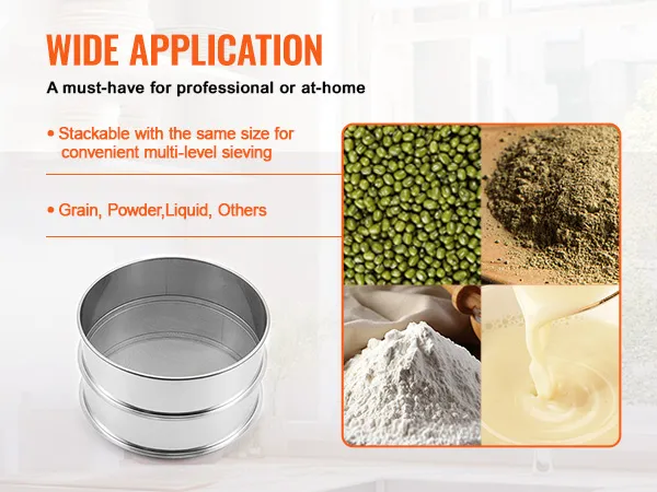 Brede toepassing: veel gebruikt in restaurants, bakkerijen, graanmolens, thuiskeukens, enz. Ideaal voor het zeven en filteren van onzuiverheden en klontjes uit droge ingrediënten zoals meel, suiker en kruiden, maar ook granen zoals bonen, rijst en pasta.