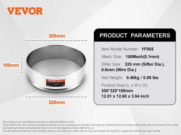 320 mm (zeefdiameter), 0,6 mm (draaddiameter)